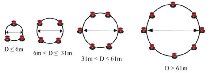 航空障碍灯的层数设置和数量取决于结构体的高度,如下表: